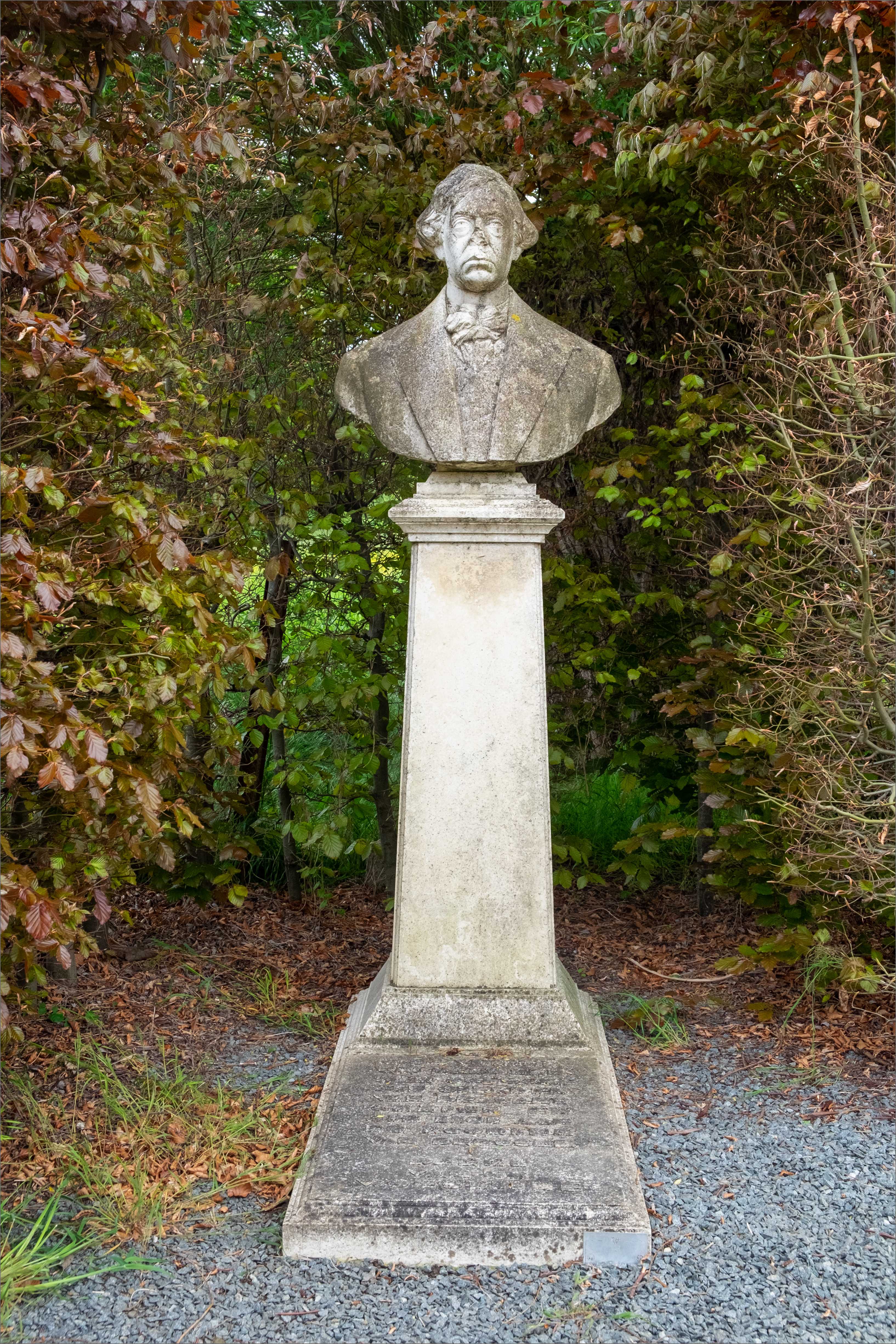 Standbeeld van de dichter Karel van de Woestijne, de voet is onleesbaar en mag wel eens schoongemaakt worden. Op de achterkant veronderstel ik de beeldhouwer?
