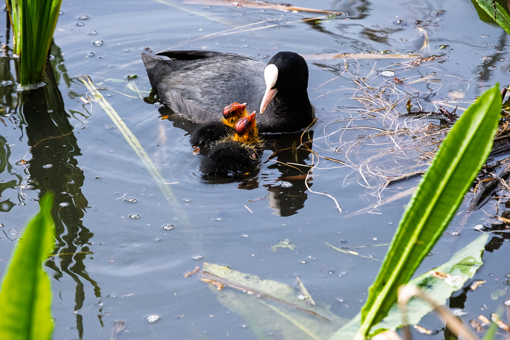 Op je foto’s zie je een meerkoet die haar pasgeboren kuikens voedt. De kuikens zijn onmiskenbaar: gitzwart dons met een opvallend oranje-rood hoofd en een felrode snavel die wijd opengesperd bedelt om voedsel. Die felle kleuren zijn geen toeval — ze stimuleren de oudervogel om te blijven voederen.