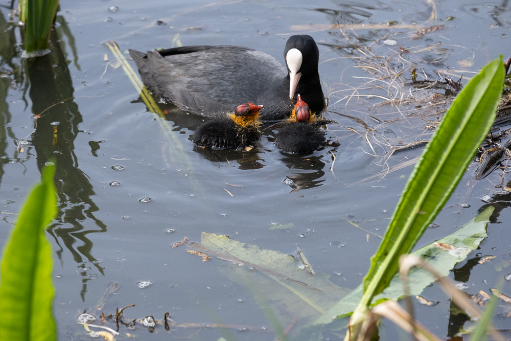 Op je foto’s zie je een meerkoet die haar pasgeboren kuikens voedt. De kuikens zijn onmiskenbaar: gitzwart dons met een opvallend oranje-rood hoofd en een felrode snavel die wijd opengesperd bedelt om voedsel. Die felle kleuren zijn geen toeval — ze stimuleren de oudervogel om te blijven voederen.